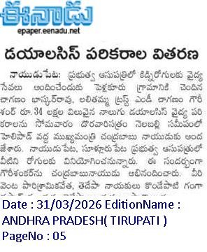 Dialysis Units Worth ₹35.45 Lakhs Sanctioned for Nellore District
