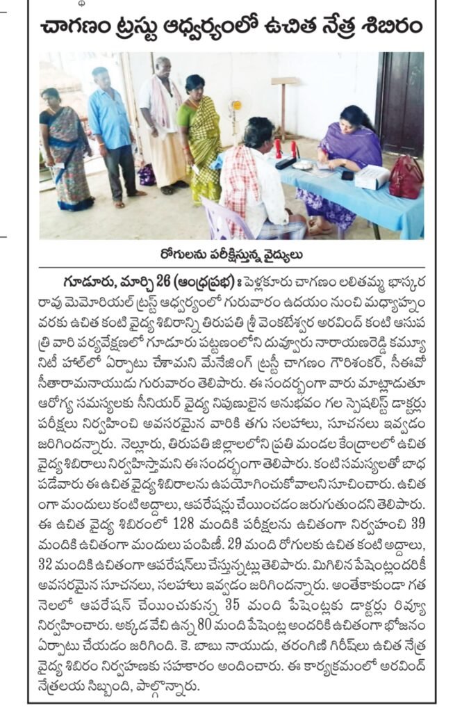 A free eye medical camp organized by the Chaganam Lalithamma Bhaskar Rao Memorial Trust received an excellent response in Gudur town. The camp was conducted on March 26, 2026, at Duvvuru Narayana Reddy Community Hall under the supervision of Tirupati Sri Venkateswara Aravind Eye Hospital.